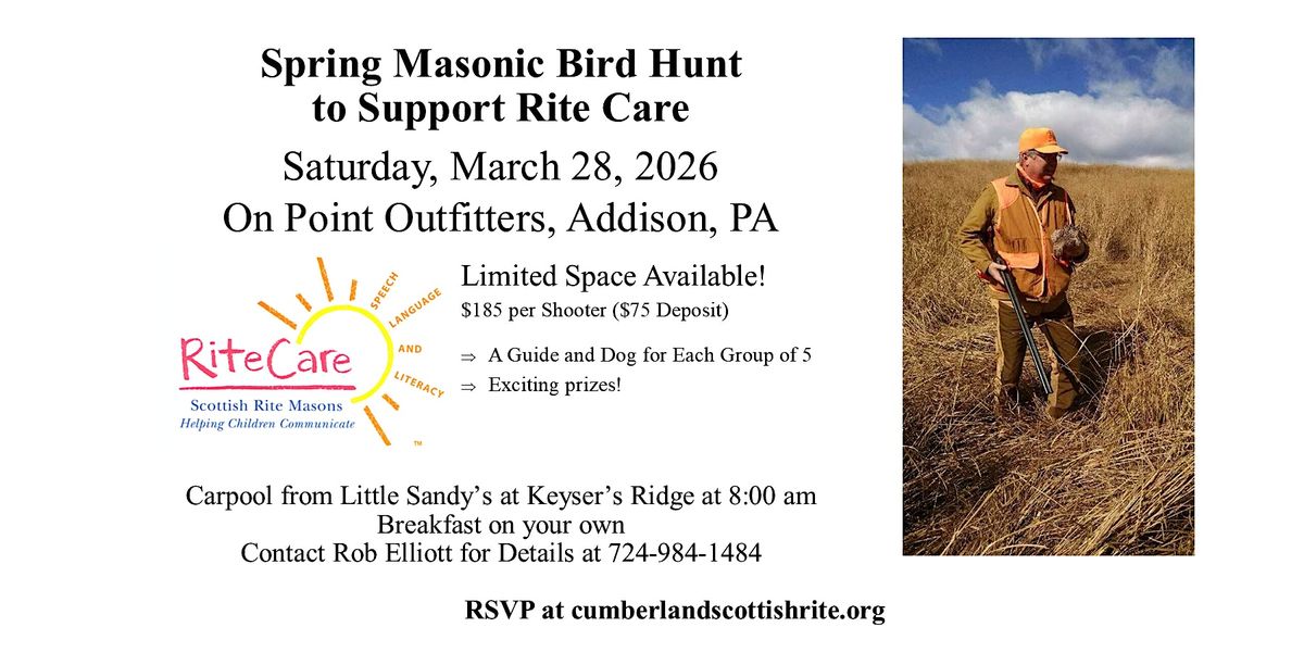 The 10th Annual Masonic Bird Hunt to benefit the Scottish Rite Care Childhood Speech and Language Clinic is scheduled for Saturday, November 1, 2025. Register online or call now to secure your spot! Meet up at Little Sandy's at Keyser's Ridge at 8:00 am for breakfast and carpool to On Point Outfitters in Addison, PA for a day of fun and fellowship, all for a good cause.