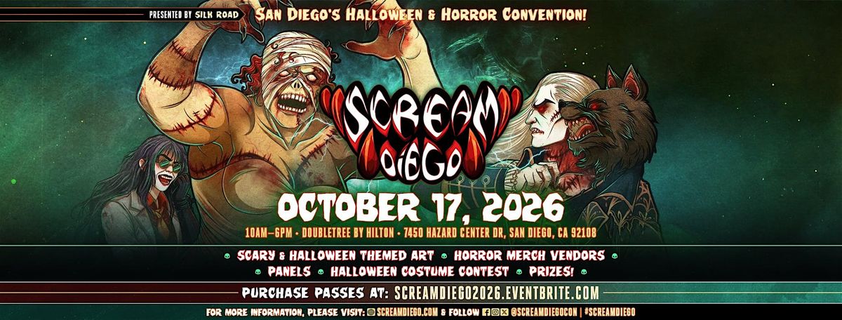 Scream Diego RETURNS this October 17, 2026! The exciting return of San Diego's Halloween and Horror convention is going to make you SCREAM!!!