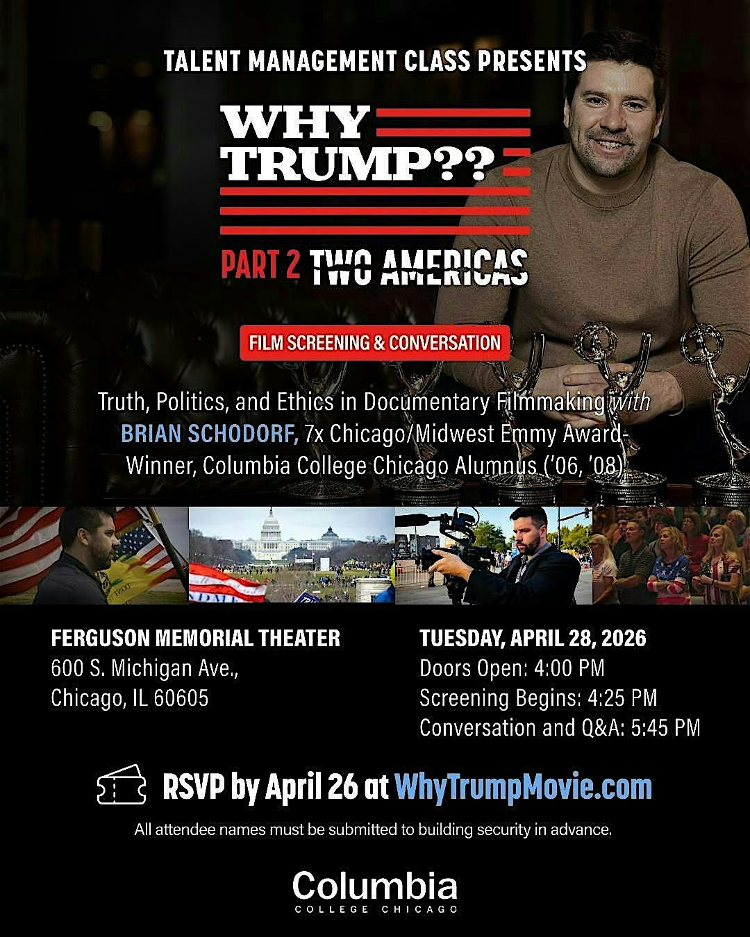 Join Columbia College Chicago’s Talent Management Class for a special screening and conversation with 7x Chicago/Midwest Emmy Award-winning filmmaker Brian Schodorf, Columbia College Chicago alumnus (’06, ’08). This event will explore the theme Truth, Politics, and Ethics in Documentary Filmmaking, offering students, alumni, and the public an inside look at the creative and ethical challenges of telling politically charged stories in today’s media landscape. Schodorf will share insights from his career as an award-winning filmmaker and discuss the responsibility of documentary storytellers when navigating truth, bias, perspective, and public impact. The program includes a screening followed by a keynote conversation and audience Q&A. The event will take place at Ferguson Memorial Theater, 600 S. Michigan Ave., Chicago. Doors open at 4:00 PM, screening begins at 4:25 PM, and the conversation and Q&A begin at 6:15 PM. RSVP is required, and all guests must register in advance.