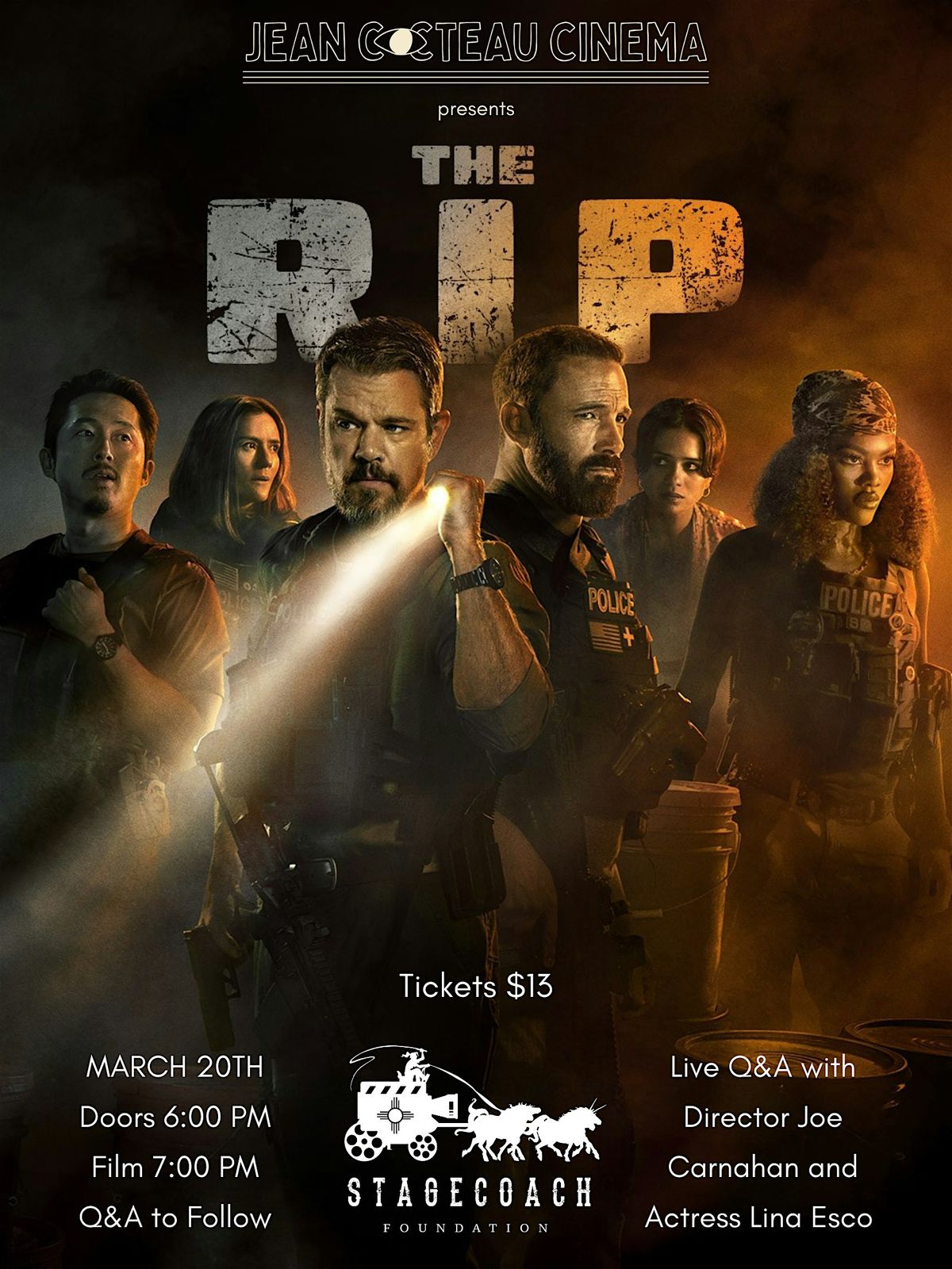 Join Stagecoach Foundation for an exclusive screening of The Rip at the legendary Jean Cocteau Cinema, followed by a live Q&A with director Joe Carnahan and actress Lina Esco.