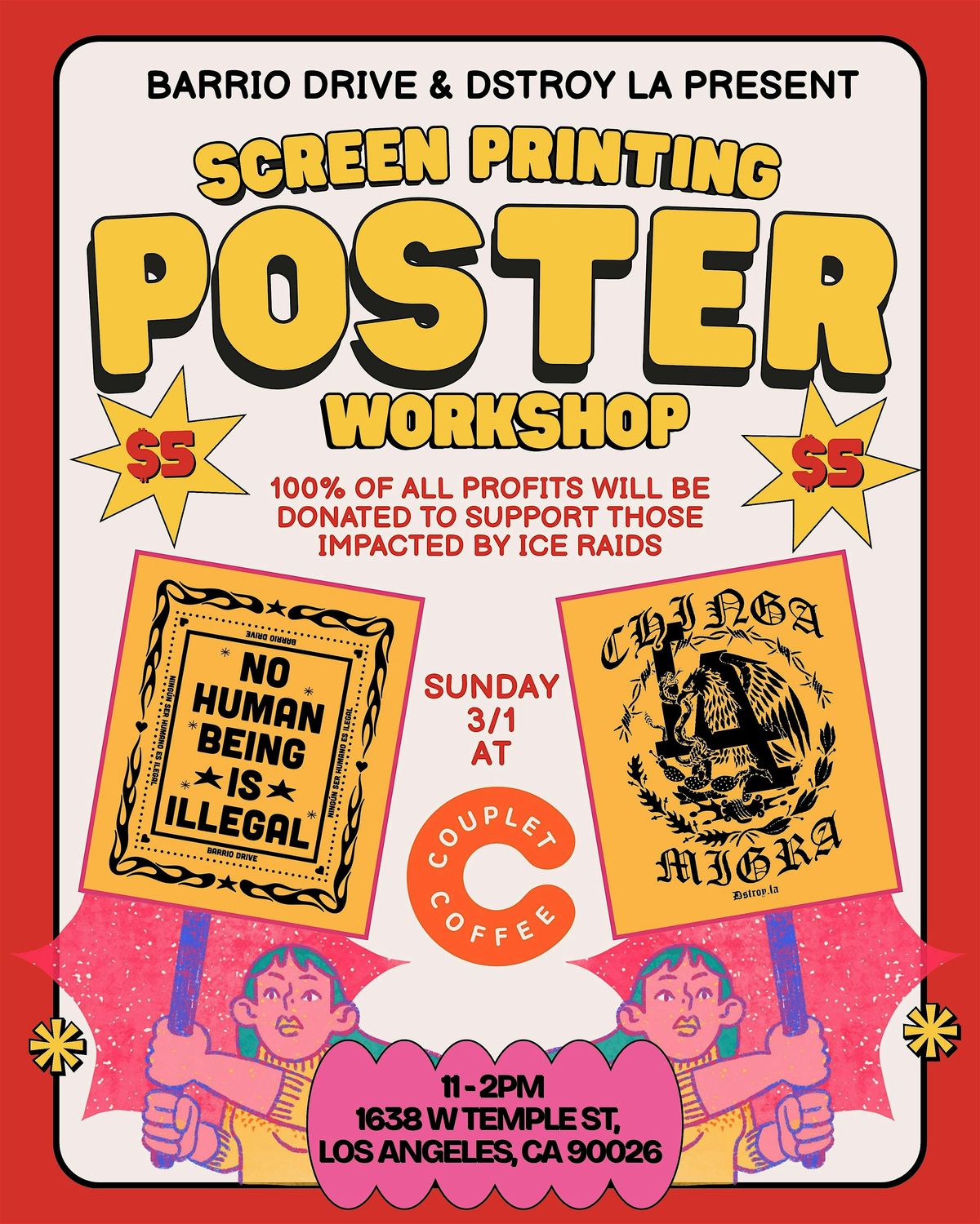 We will be teaching you how to screen print posters at Couplet on Sunday March 1st from 11am - 2pm. 1638 W Temple St, Los Angeles, CA 90026