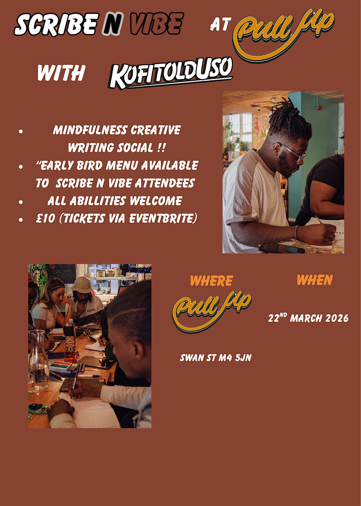 Join us at the Pull Up Bar Cafe for an awesome afternoon of creativity and good vibes! Whether you’re here to write, chill, or just soak up the atmosphere, it’s all about expressing yourself and connecting with cool people.