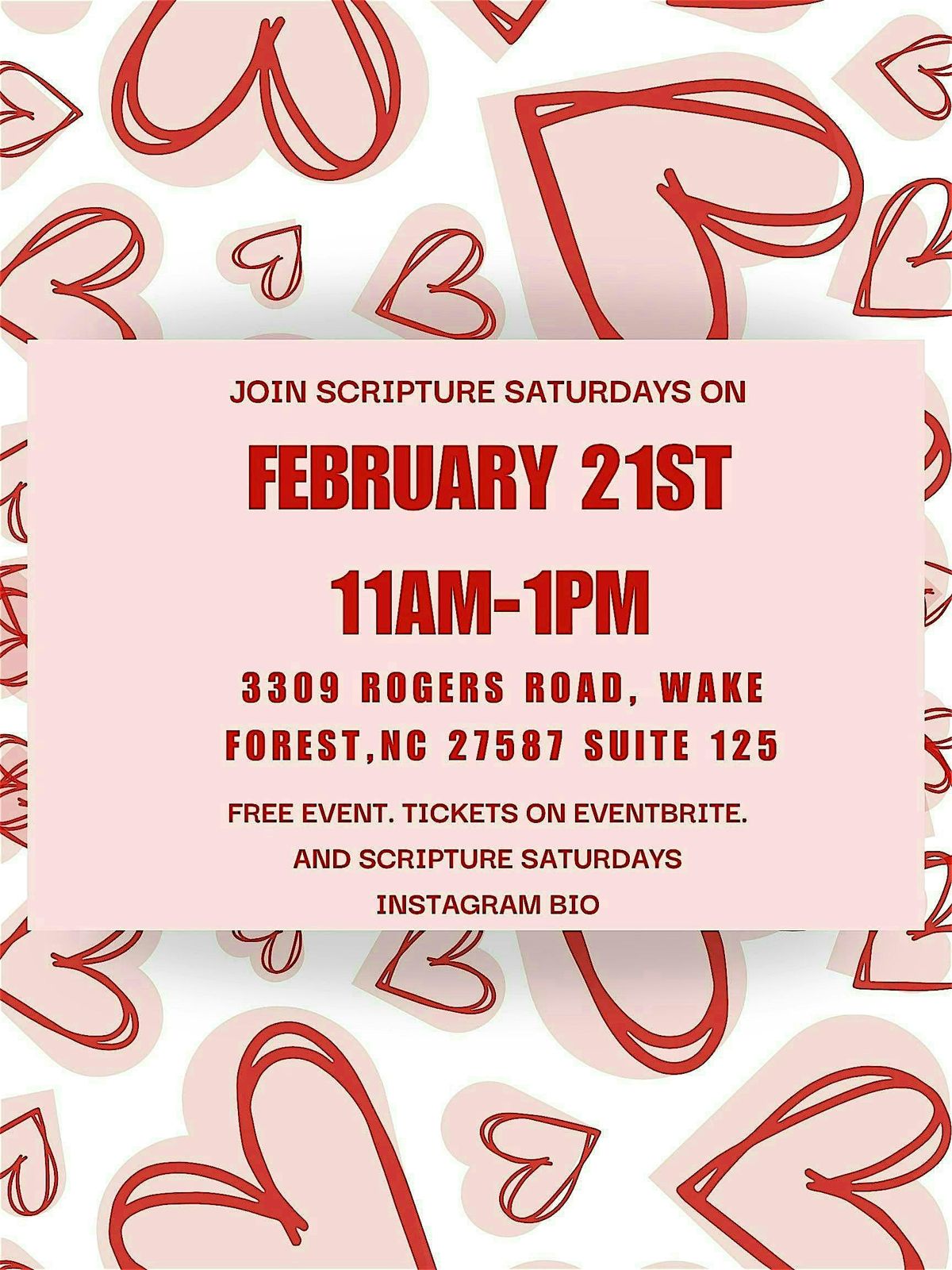 Welcome to Scripture Saturdays! Join us at 3309 Rogers Road, Wake Forest NC 27587 Suite 125 on February 21st, 2026 at 11:00 AM for a day filled with fellowship and building Christ centered community. Let's dive into the Word together and strengthen our faith. Don't miss this opportunity to connect with like-minded individuals, do some Bible trivia and fellowship. Bring your Bible and invite a friend.Mark your calendars and we'll see you there!