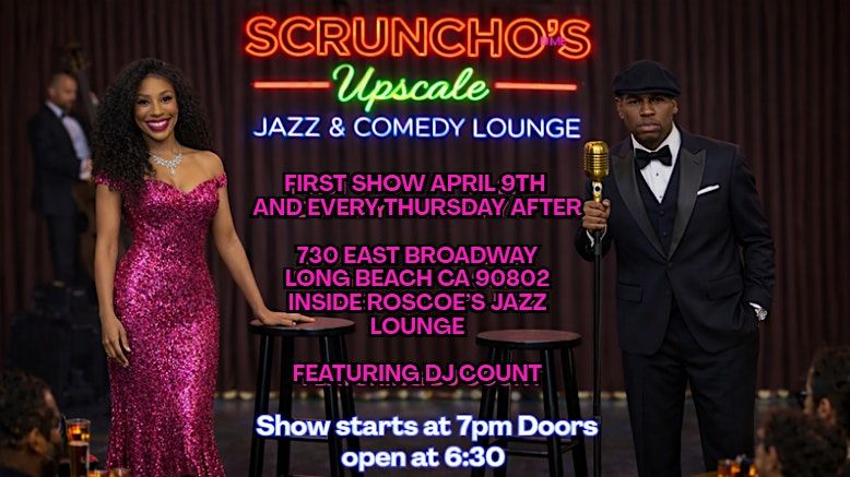 Step into a night full of smooth jazz vibes and belly-aching laughs at Scruncho's Upscale Jazz & Comedy Lounge. This in-person event blends top-notch comedy with sultry jazz tunes for an unforgettable evening. Kick back, sip your favorite drink, and enjoy the perfect mix of cool rhythms and hilarious acts. It's the ultimate hangout for anyone who loves good music and great humor—see you there!