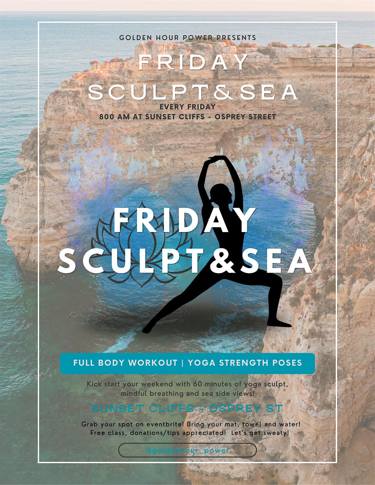 Join us for a kickass outdoor yoga sculpt session at Sunset Cliffs in Ocean Beach every Friday/Saturday morning at 8am! Plug in Sunset Cliffs Parking lot or Rum Runner's Cove and you'll see us-the spot where Osprey St intersects the cliffs! All levels are welcome!
