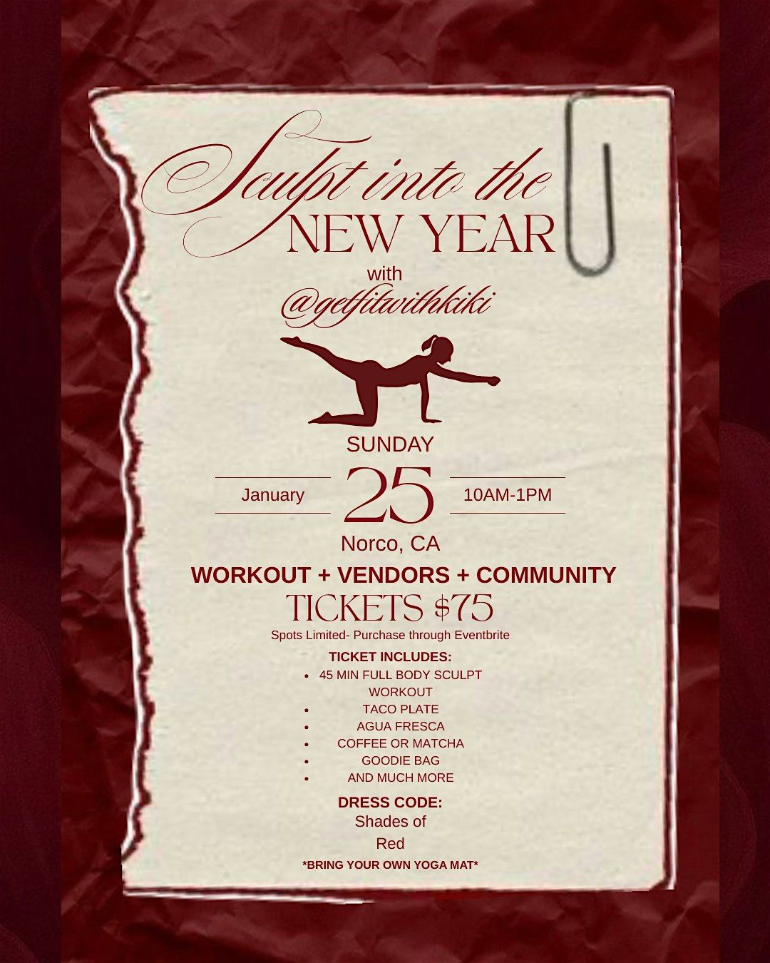 Are you ready to sculpt into the NEW YEAR with @getfitwithkiki? Join us on January 25, 2026 at 10:00 AM for an energizing fitness event! Let's kickstart the year with a fun workout session led by the amazing Kiki. Get ready to sweat, laugh, and feel the burn as we embrace the new year together. Don't miss out on this opportunity to start your year on a healthy note!