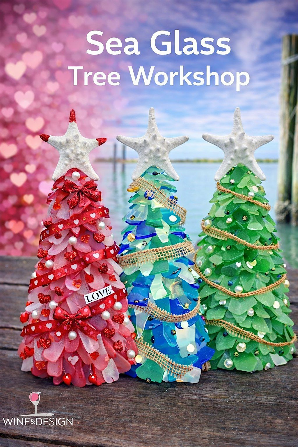 Get Your Art Buzz On at Wine & Design! No artistic talent needed, just the desire to have fun! We provide all crafting materials for you to complete your very own sea glass Christmas Tree masterpiece. No experience necessary, our artist will help you design and complete your frame.