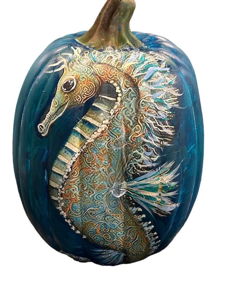 Sherrys Art Studio Palm Coast. Bring in your own pumpkin 10" or taller...... "Fall" in love..... our newest workshops. Sea Horse Pumpkin. Using Decoupage Tissue Paper, Paint and Mod Podge come learn how to create this amazing Coastal Pumpkin. PUMPKIN NOT INCUDEDED. Please bring in a pumpkin 10" or taller. Limted Seats. www.sherrysartstudio.info
