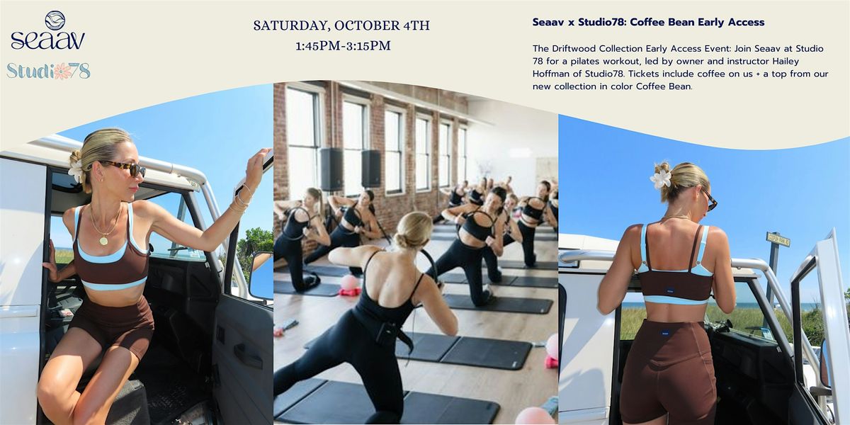 ☕ 🤎 The Driftwood Collection Early Access Event: Join Seaav at Studio 78 for a pilates workout, led by owner and instructor Hailey Hoffman of Studio78. Tickets include coffee on us + a top from our new collection in color Coffee Bean.