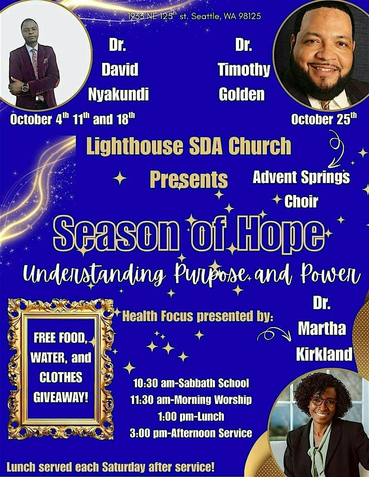 This is event is for all people and for all ages. Every Saturday in the month of October starting at 10:30am, we will have in depth discussion about current events with a biblical foundation. We will also have inspiring messages on spiritual and mental health that will set your mind and heart at ease. Free lunch and refreshments will be provided for all.
