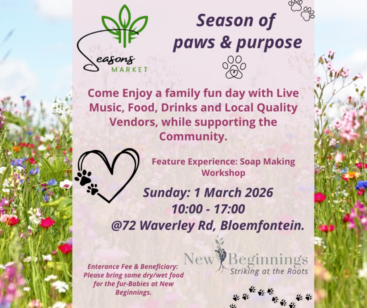 The Season's Market is more than just a market — it’s a space to slow down, support local, and give back to the community. Enjoy a relaxed garden atmosphere filled with locally handcrafted vendors, live music, and a hands-on soap-making workshop, all while supporting New Beginnings as our beneficiary to help care for their fur babies