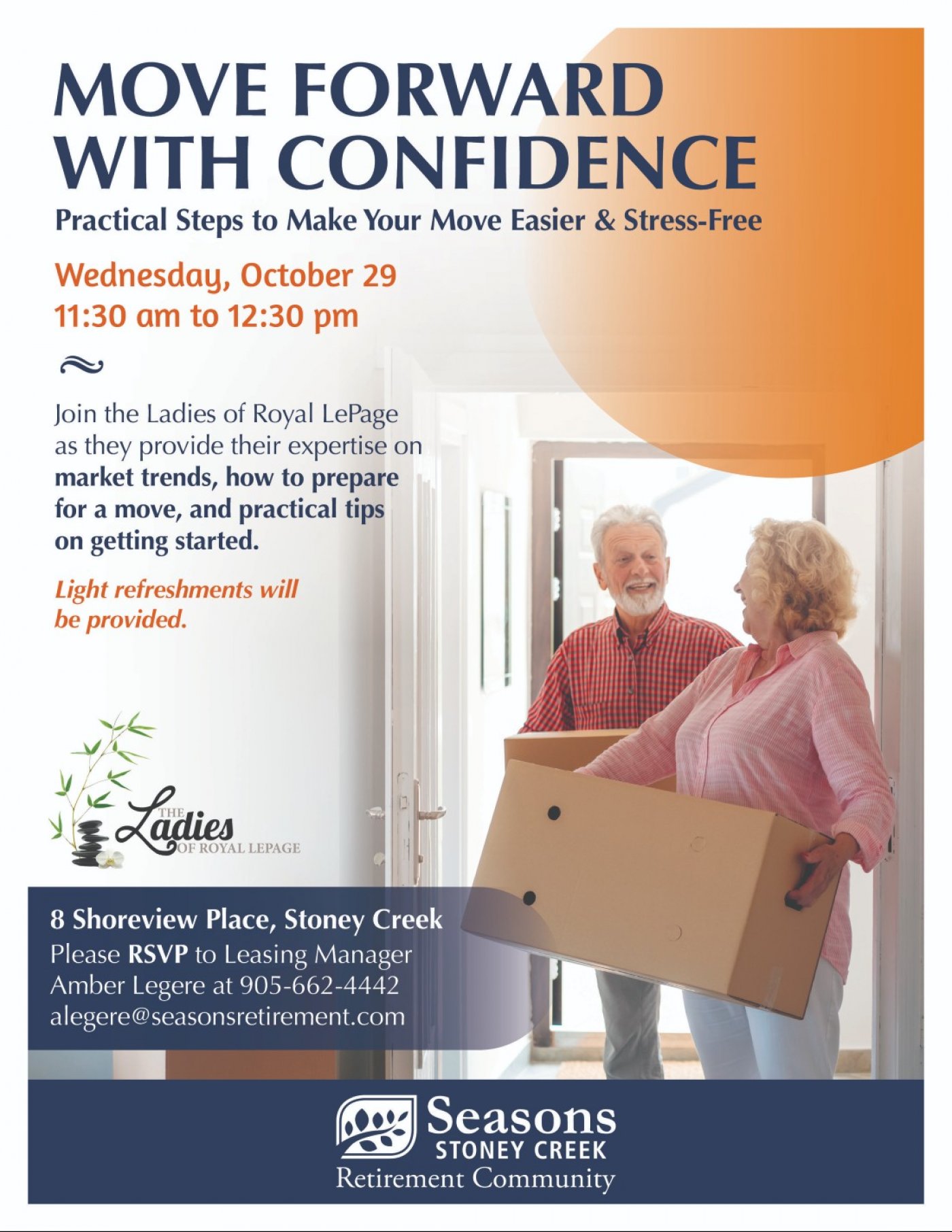 Join Seasons Stoney Creek and the Ladies of Royal LePage for their practical steps on how to make your move easier and stress free!