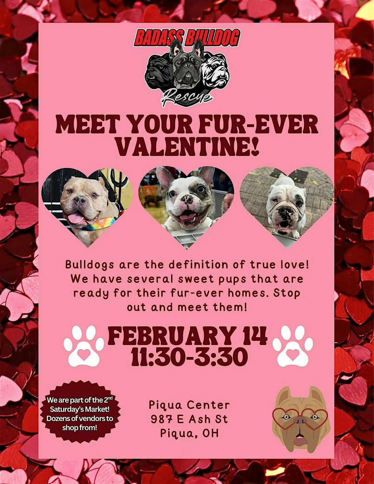 What better way to spend Valentine's day than by getting some bulldog love! Come out to the Piqua Center, treat yourself to something nice & meet some adorable available bulldogs!