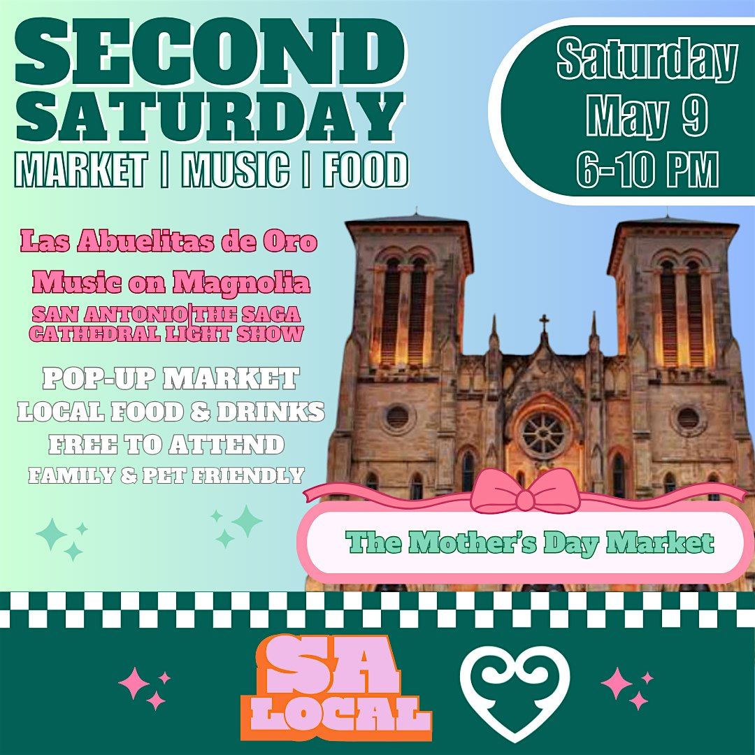 Join us for our Second Saturday|San Antonio - Mother’s Day Market! Happening Saturday, May 9 from 6-10PM, at Main Plaza in front of the San Fernando Cathedral.