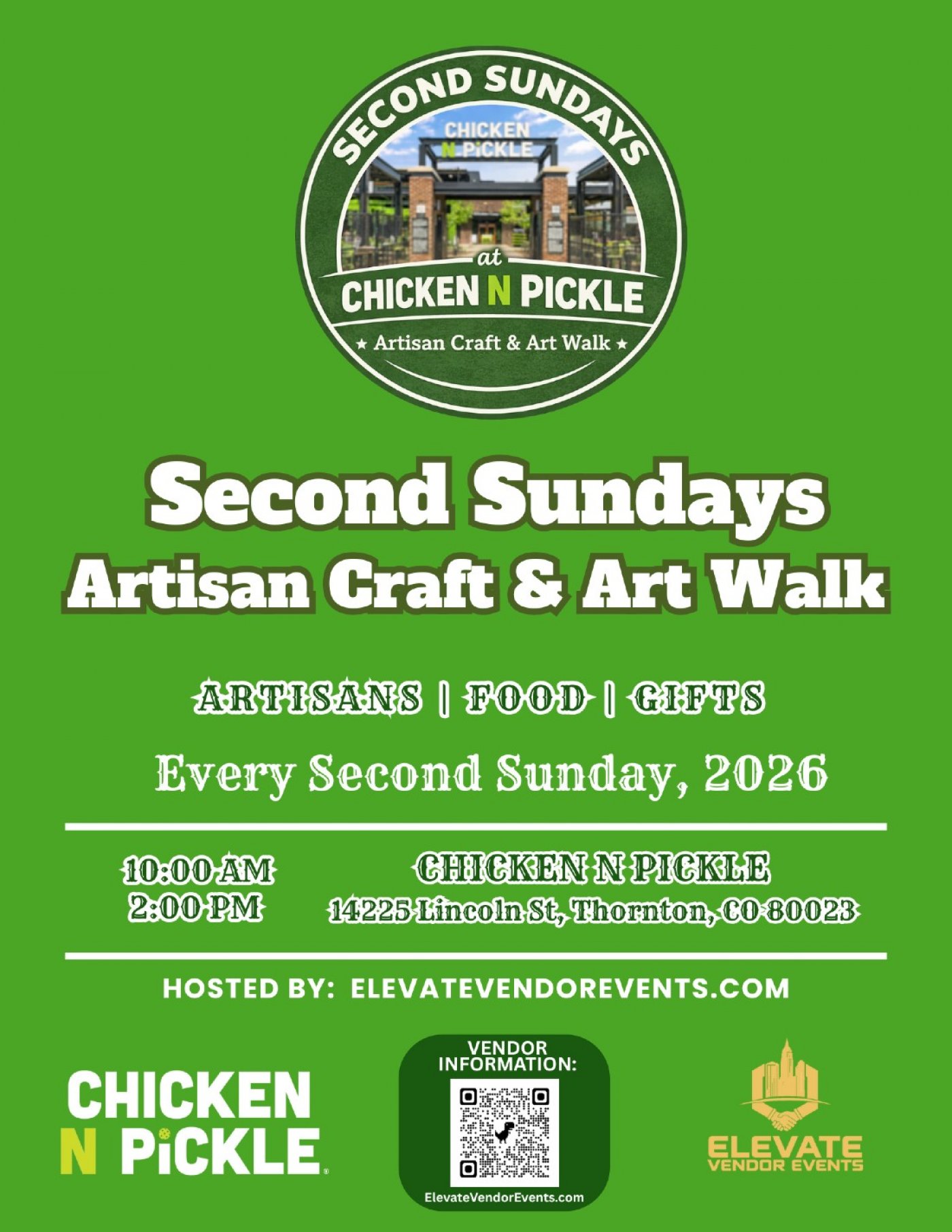 Second Sundays is a monthly Artisan Craft & Art Walk hosted at Chicken N Pickle in Thornton, beginning Sunday, January 11, 2026, and continuing every second Sunday of the month.