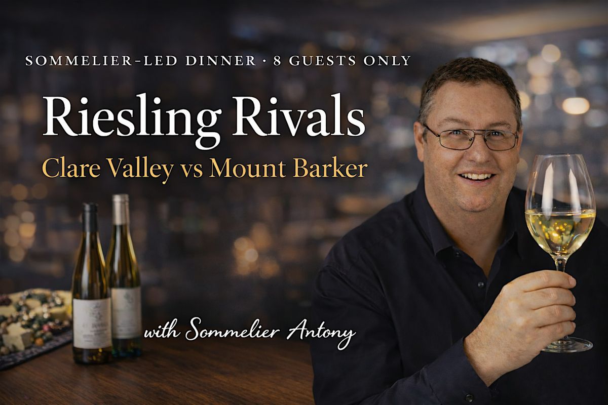 Join us for a special once-only exploration into these two (three) Riesling Regions ! Join our sommelier, Antony Anderson (WSET4), for a delightful evening of exploring the history and flavours of six cellared wines, from Australia's Clare Valley (SA)and Mount Barker (WA), over a perfectly matched three-course dinner (see the line-up below).