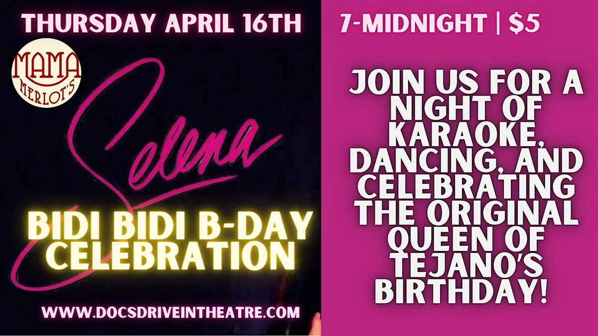 Join us at Mama Merlot's Speakeasy on April 16, 2026 at 7:00 PM - Midnight for a fun and lively night celebrating Selena's iconic hit, Bidi Bidi Bom Bom! Expect great vibes, good company, and a party atmosphere that’ll have you dancing all night. Don’t miss out on this special in-person event where fans come together to honor the Queen of Tejano music. See you there! Food and drinks available all night!
