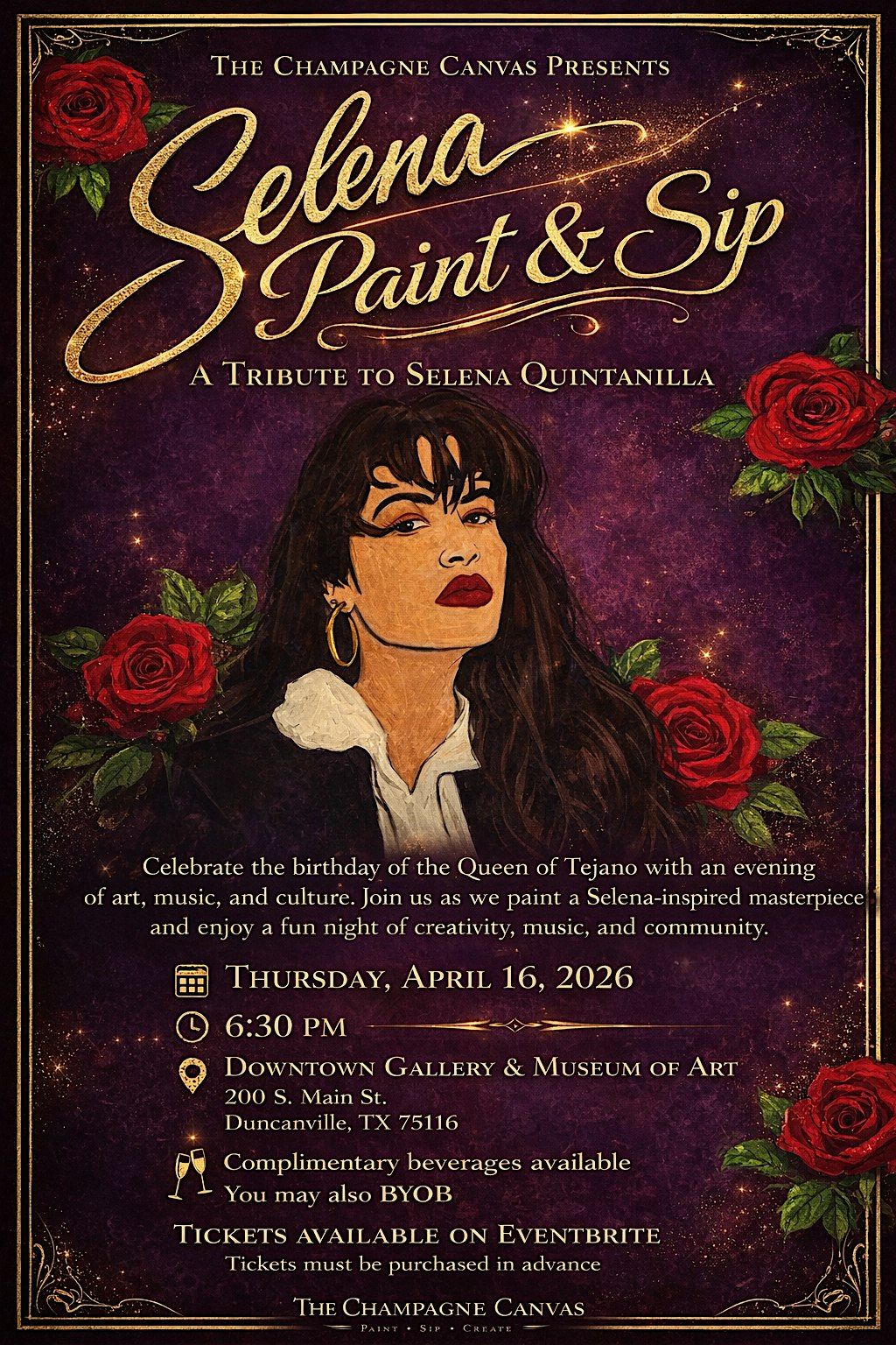 Ready for a fun, chill night? Come hang out in person at Selena Paint & Sip! Whether you're a total newbie or a painting pro, this event is all about good vibes, creativity, and maybe a little sip to get those creative juices flowing. Bring your friends or make new ones while painting your own masterpiece. Don't miss out on a night of laughs, colors, and cool company! Celebrating Selena's Birthday in April 16th!