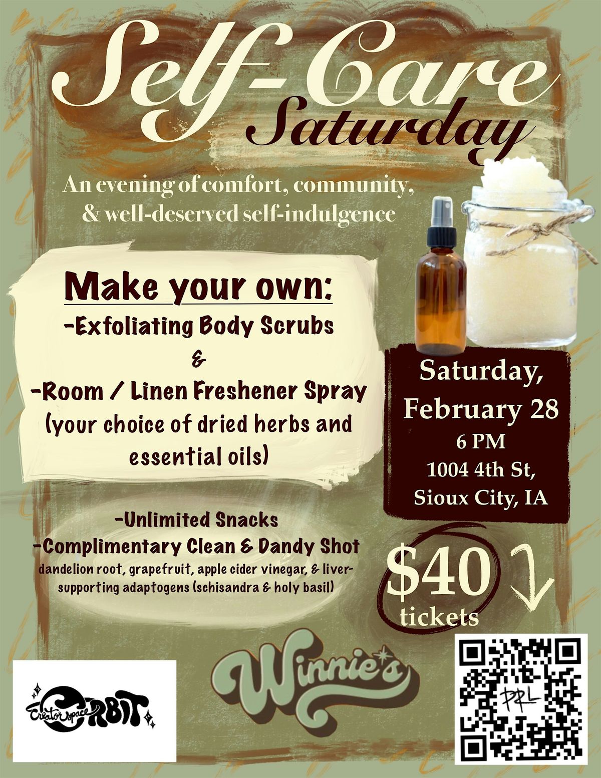 Join us at Winnie's for a fun & relaxing Self-Care Saturday. Each ticket includes unlimited snacks and a complimentally Clean & Dandy Shot from Winnie's! During this hands-on event, you will make your own Exfoliating Body Scrubs and Room / Linen Frehner Spray, as artist Pearl Renae walks you through the process step-by-step. You will explore different dried herbs and essential oils, used to personalize your products exactly how you wish!