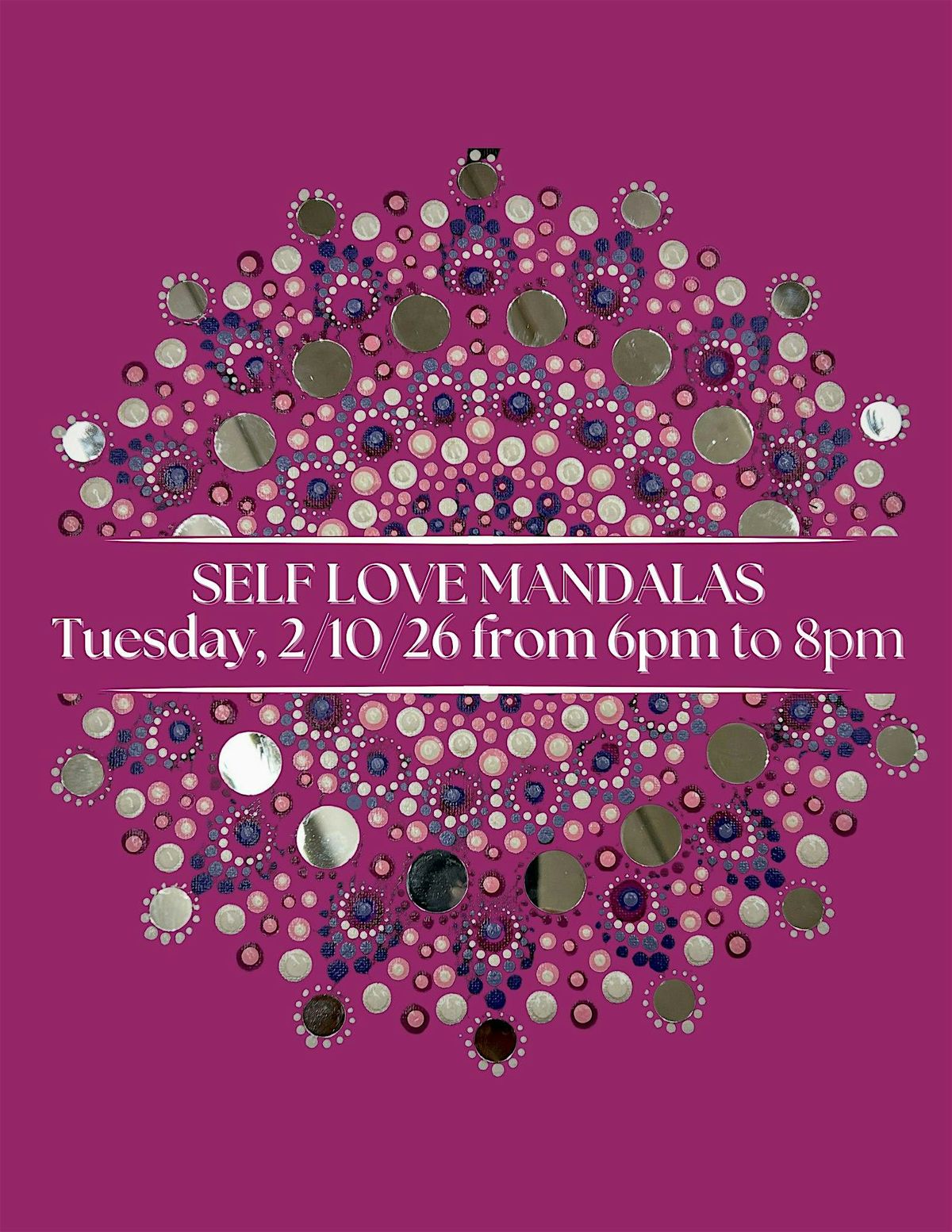 This February, step into a heart-centered mandala experience designed to nurture self-love, compassion, and inner connection. In this themed dot-painting class, we’ll create mandalas that incorporate multiple mirrors woven throughout the design—inviting reflection, presence, and a deeper relationship with yourself.