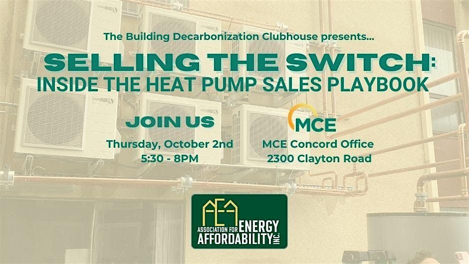 Our monthly Building Decarbonization Clubhouse keeps rotating — and on Thursday, Oct 2 at 5:30 PM we’ll meet at MCE’s Concord office for a fresh conversation on one of the most important drivers of electrification: how heat pumps are sold. Selling the Switch: Inside the Heat Pump Sales Playbook will take you inside the strategies that contractors and distributors are using to win customers over. We’ll explore: