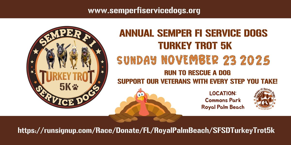 Semper Fi Service Dogs rescues dogs and train them as service dogs for Veterans suffering from PTS, TBI & MST. All of this is at no cost to the Veteran and funded by donations and grants. We need your support! Please join us and register on: https://runsignup.com/Race/FL/RoyalPalmBeach/SFSDTurkeyTrot5k