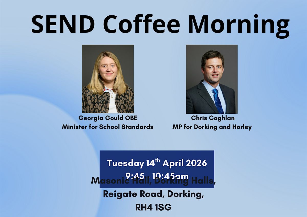 Georgia's ministerial portfolio includes Special Educational Needs and high needs children. If you are a Surrey parent or carer for a SEN child, please come along to share your experience of the SEND system.