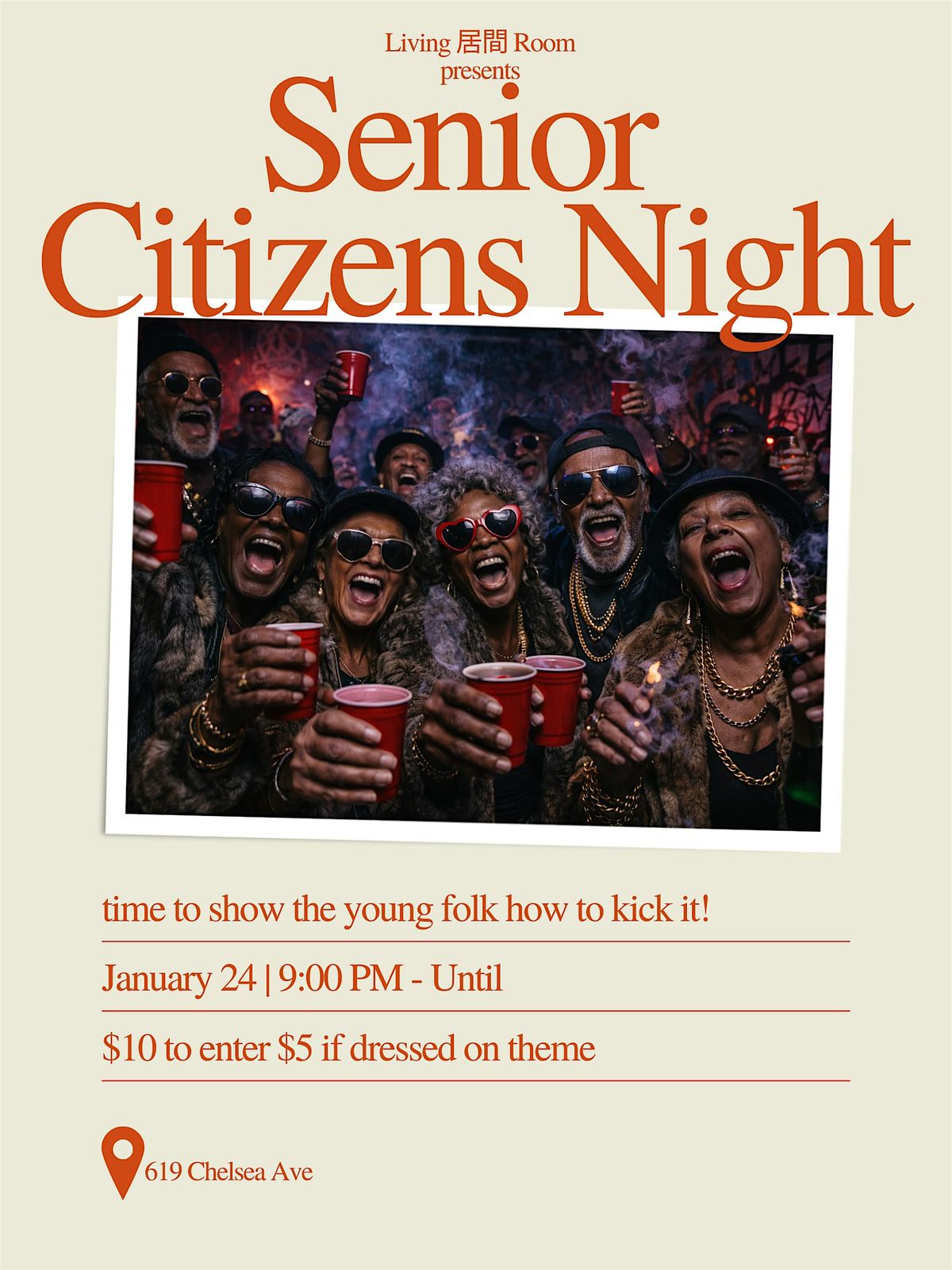 Welcome to Senior Citizens Night at 619 Chelsea Ave! Join us on February 14, 2026 at 9:00 PM for a night of fun and laughter and fire tunes while dressed as seniors citizens! Doors open at 9pm and it's only $10 to enter ($5 if dressed as an old person!) 3 different DJs and drinks will be served to keep you on your feet! As always this is a smoke friendly event!