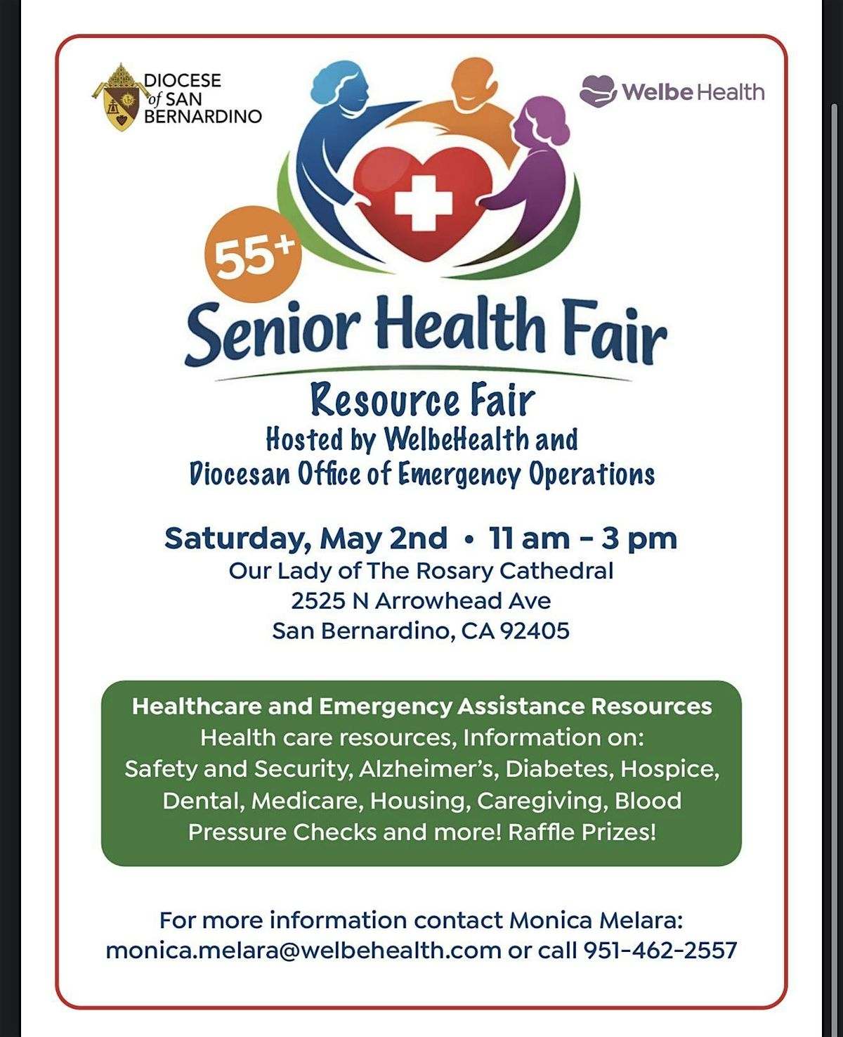 We are excited to announce that we have partnered with the Diocese of San Bernardino to host a community health fair dedicated entirely to our seniors. This event is designed to provide valuable resources, health screenings, and information to help the older adults in our community live healthy, vibrant lives.