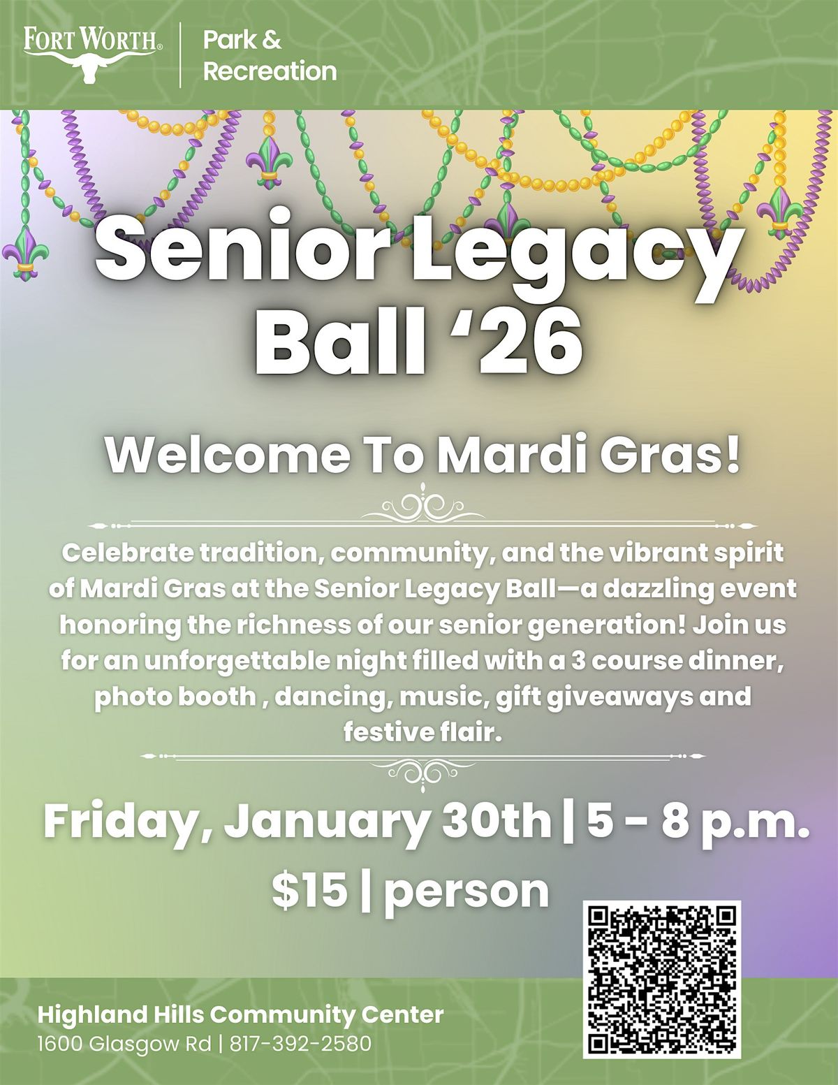 Get ready for an unforgettable Senior Legacy Ball at Highland Hills Community Center on Friday, January 30th, 5–8pm! Enjoy a live DJ, dancing, performances, vendors, gift giveaways, and a fun photo booth. Savor a delicious dinner featuring Cajun sausage pasta, steamed green beans, fresh salad, and mini king cake slices for dessert. This celebration is geared toward senior citizens, but all ages are welcome to join the fun! 🎶✨ Call 817-392-2580 to fully register for the event or visit Activity detail | Fort Worth Online Reservations & Registrations to register online. EVENT IS NOT FREE. YOU MUST SIGN UP ONLINE OR OVER THE PHONE.