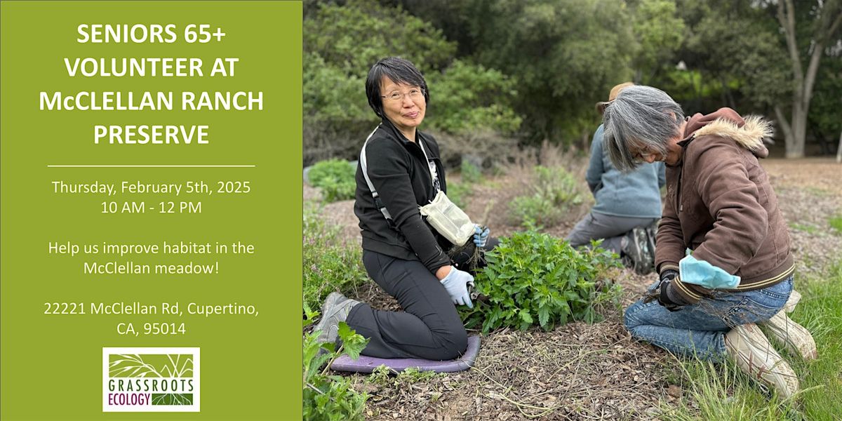 Seniors age 65 and older: join Grassroots Ecology in our ongoing restoration of the meadow at McClellan Ranch Preserve in Cupertino! We will spend our time together maintaining our restoration areas by pruning native plants and weeding invasive species. Volunteers should expect to walk along flat ground on paved and unpaved surfaces, kneel or sit on kneeling pads, and use hand tools. Stay for as long or short as you would like!