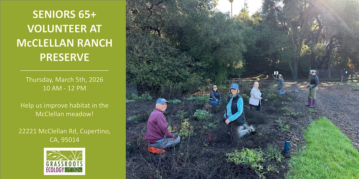 Seniors age 65 and older: join Grassroots Ecology in our ongoing restoration of the meadow at McClellan Ranch Preserve in Cupertino! We will prune last year's growth on our native plants and pull weeds growing around them. Volunteers should expect to walk paved and unpaved surfaces, kneel or sit on kneeling pads, and use hand tools. Paths and work areas are flat. Stay for as long or short as you would like!