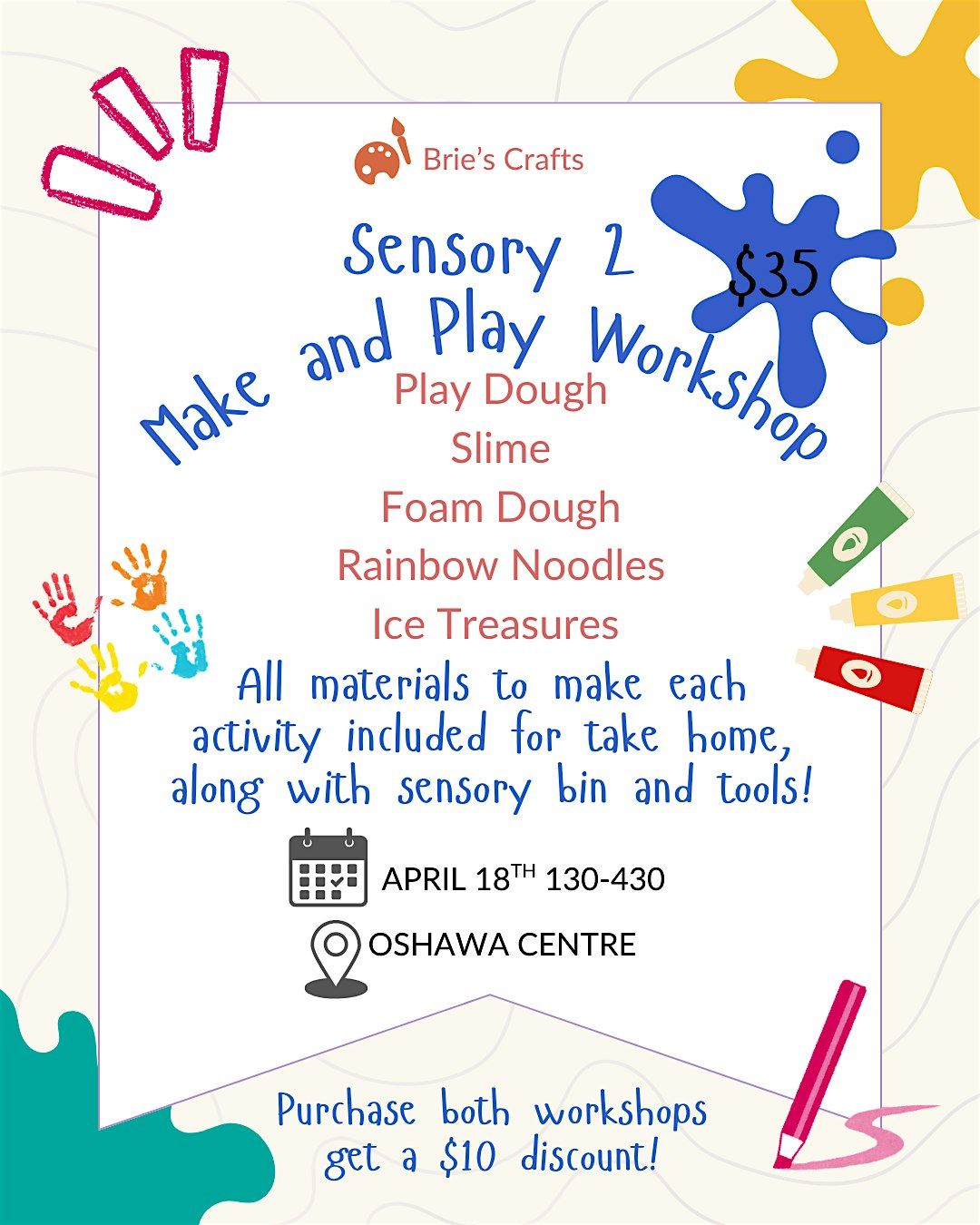 At this workshop we will be making Play Dough, Slime, Foam Dough, Rainbow Noodles, Ice Treasures. Each participant will recieve a sensory bin, some sensory bin tools, bags to take home their sensory items and all the materials and guidance to create all our sensory items!