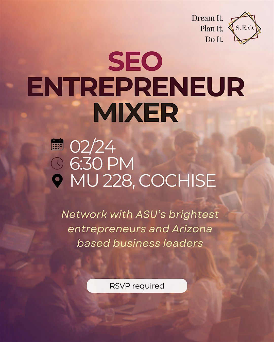 The SEO Entrepreneur Mixer is a curated networking evening that brings together Arizona based founders and ASU student entrepreneurs who are actively exploring and building ideas.