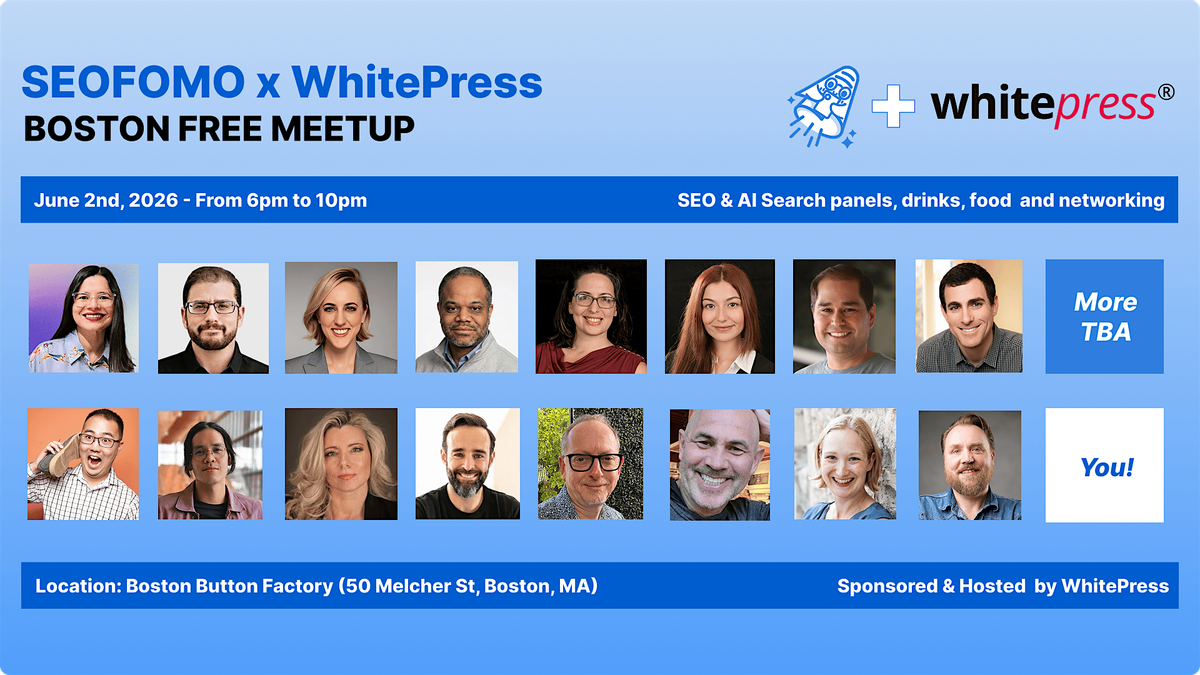 Join the next free SEOFOMO Meetup with WhitePress in Boston featuring SEO trends and AI Search panels, quizzes, giveaways, free drinks, food, and networking on June 2nd, 2026 from 6pm to 10pm, with experienced SEO and AI Search specialists: