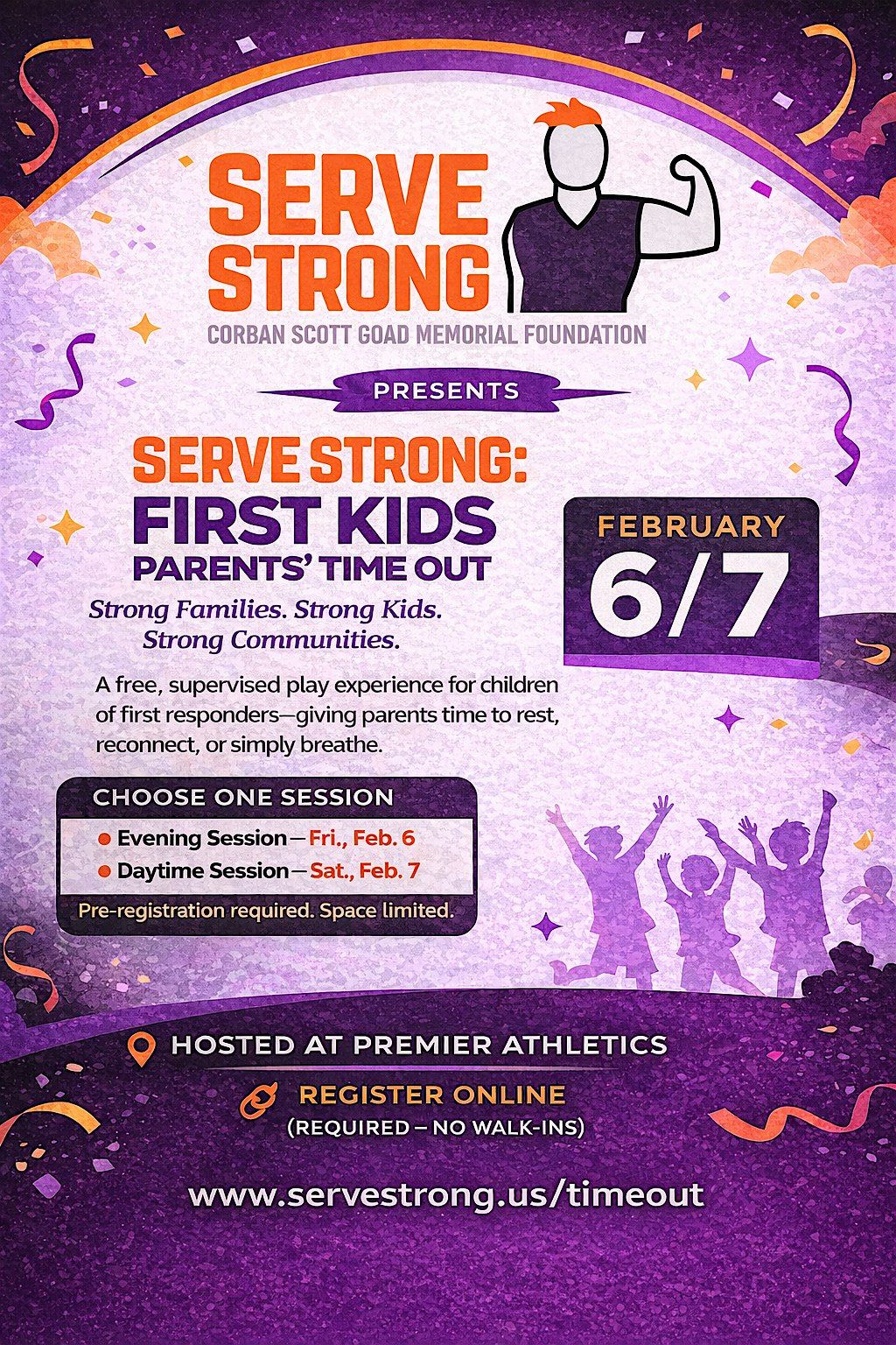 Hey parents! Need a little break? Join us for Serve Strong: First Kids Parents' Time Out, for ages 6 and up. This is an awesome in-person event just for your kids. Take some well-deserved time to relax and recharge your batteries while knowing your kids are in great hands. It’s all about giving you a moment to breathe and feel supported. Don’t miss out on this fun and refreshing experience!