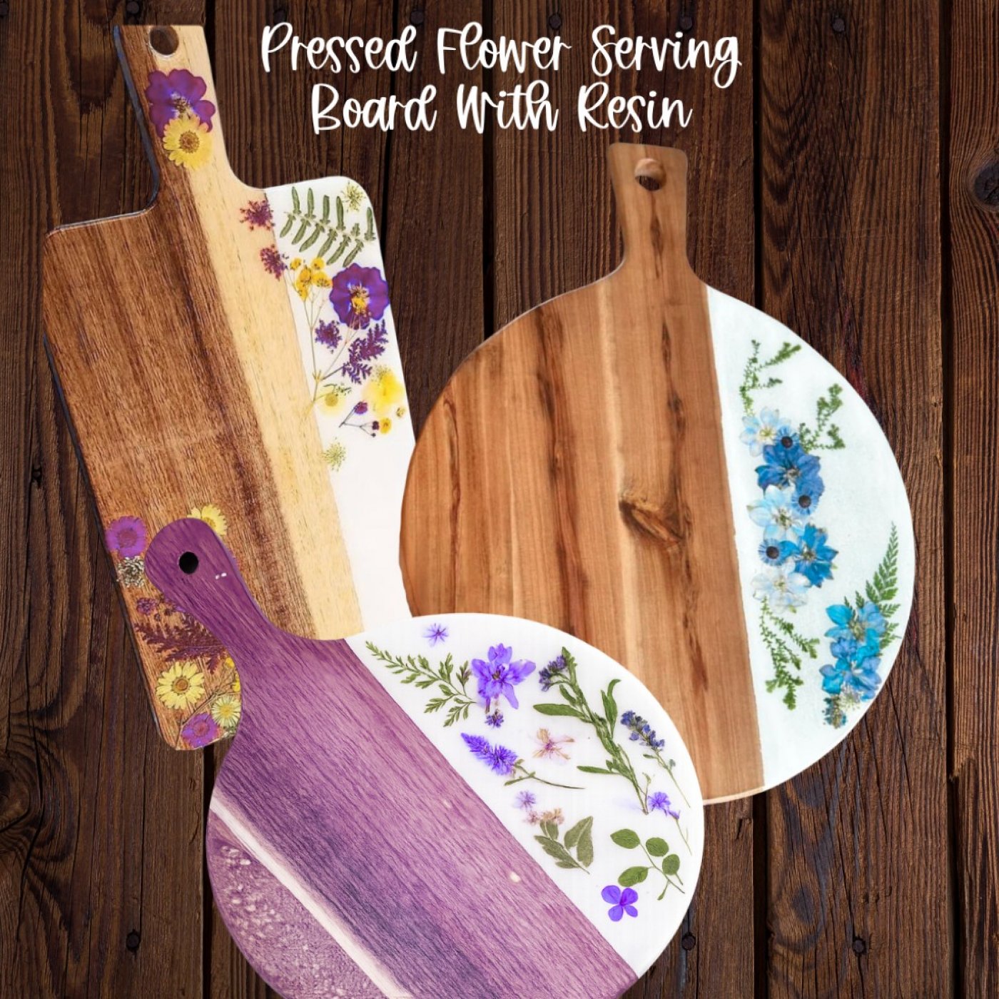 Create your own beautiful floral design serving board with pressed flowers & clear resin to seal it. Choose a round or rectangle board. We will use FDA-compliant resin