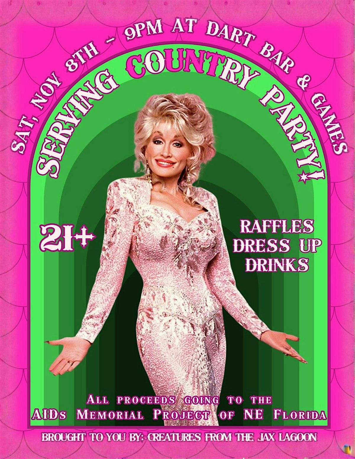 Serving Country Party — Sat, Nov 8th at 9PM! Raffles, dress-up, drinks & Dolly vibes at Dart Bar. Benefiting AIDS Memorial Project.