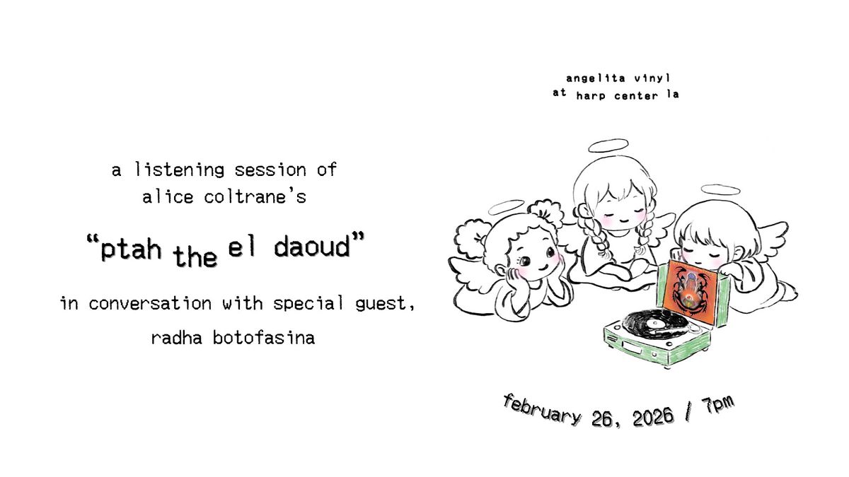 Join us for our second “angelita vinyl” session: a listening party highlighting albums that feature traditionally classical or jazz instruments. For this session, we are celebrating the renowned jazz pianist and harpist Alice Coltrane with a listening session of her 1970 album, “Ptah the El Daoud.” This album is a masterpiece of spiritual jazz, transporting the listener to unique soundscapes crafted by Coltrane’s compositions. The record also features notable collaborations with Pharaoh Sanders (tenor sax, alto flute, and bells), Joe Henderson (tenor sax and alto flute), Ron Carter (bass), and Ben Riley (drums). For this album, we are very lucky to have Radha Botofasina (harpist, pianist, vocalist, and composer), one of Alice Coltrane’s former students, in conversation with us for the discussion and Q+A portion of the evening.