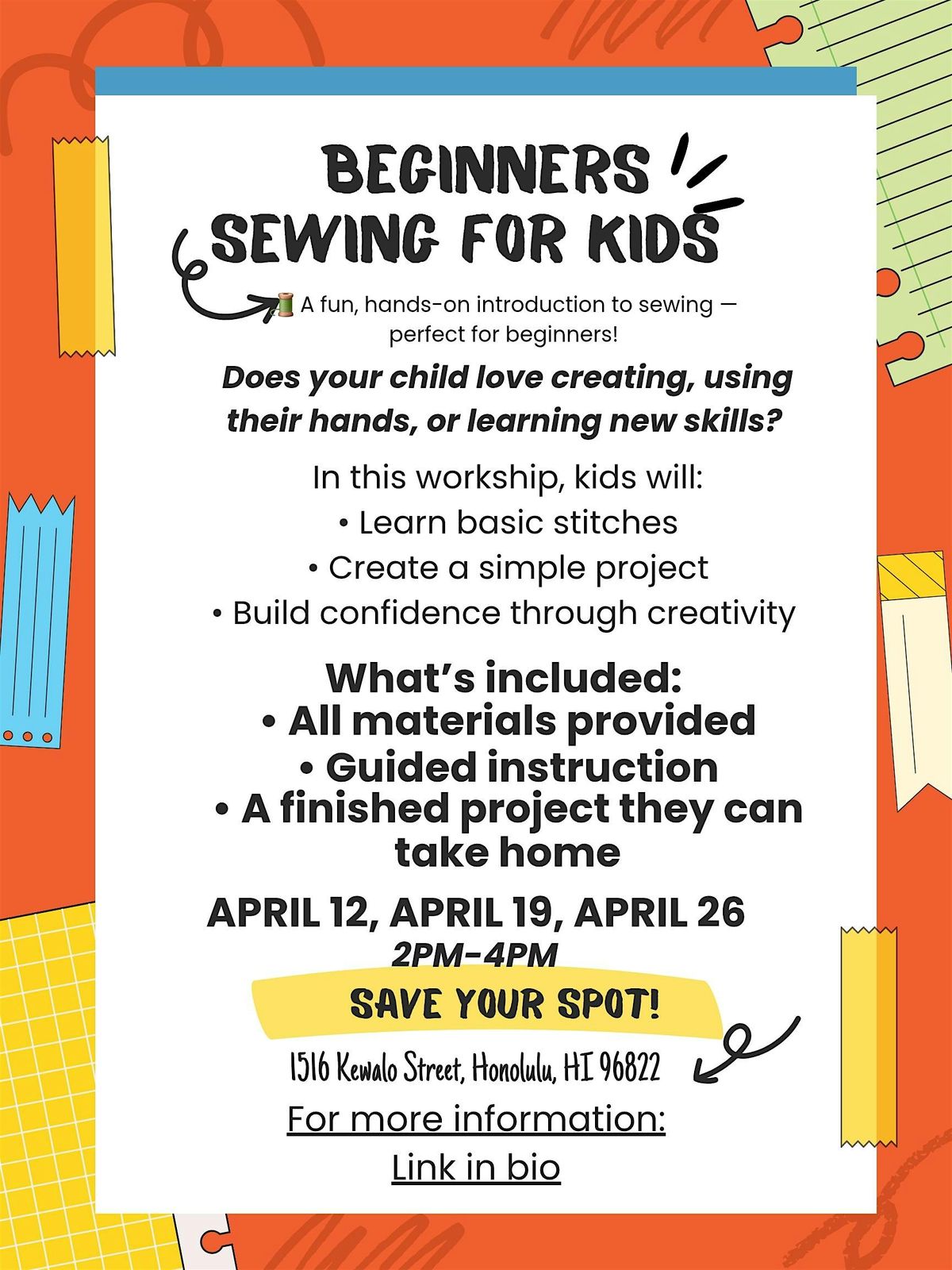 Get your little ones stitching and creating cool projects in this fun, beginner-friendly sewing hangout! Attend one class or all 3!