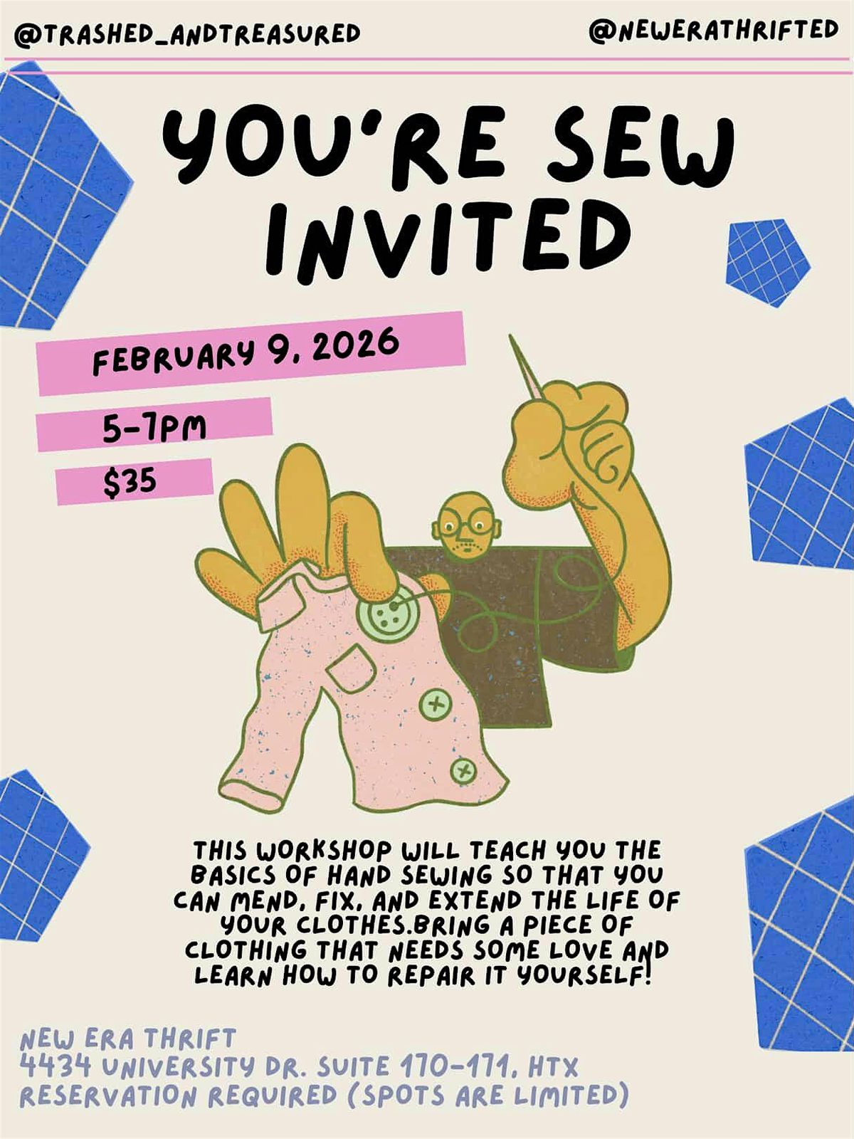 THIS WORKSHOP WILL TEACH YOU THE BASICS OF HAND SEWING SO THAT YOU CAN MEND, FIX, AND EXTEND THE LIFE OF YOUR CLOTHES.BRING A PIECE OF CLOTHING THAT NEEDS SOME LOVE AND LEARN HOW TO REPAIR IT YOURSELF