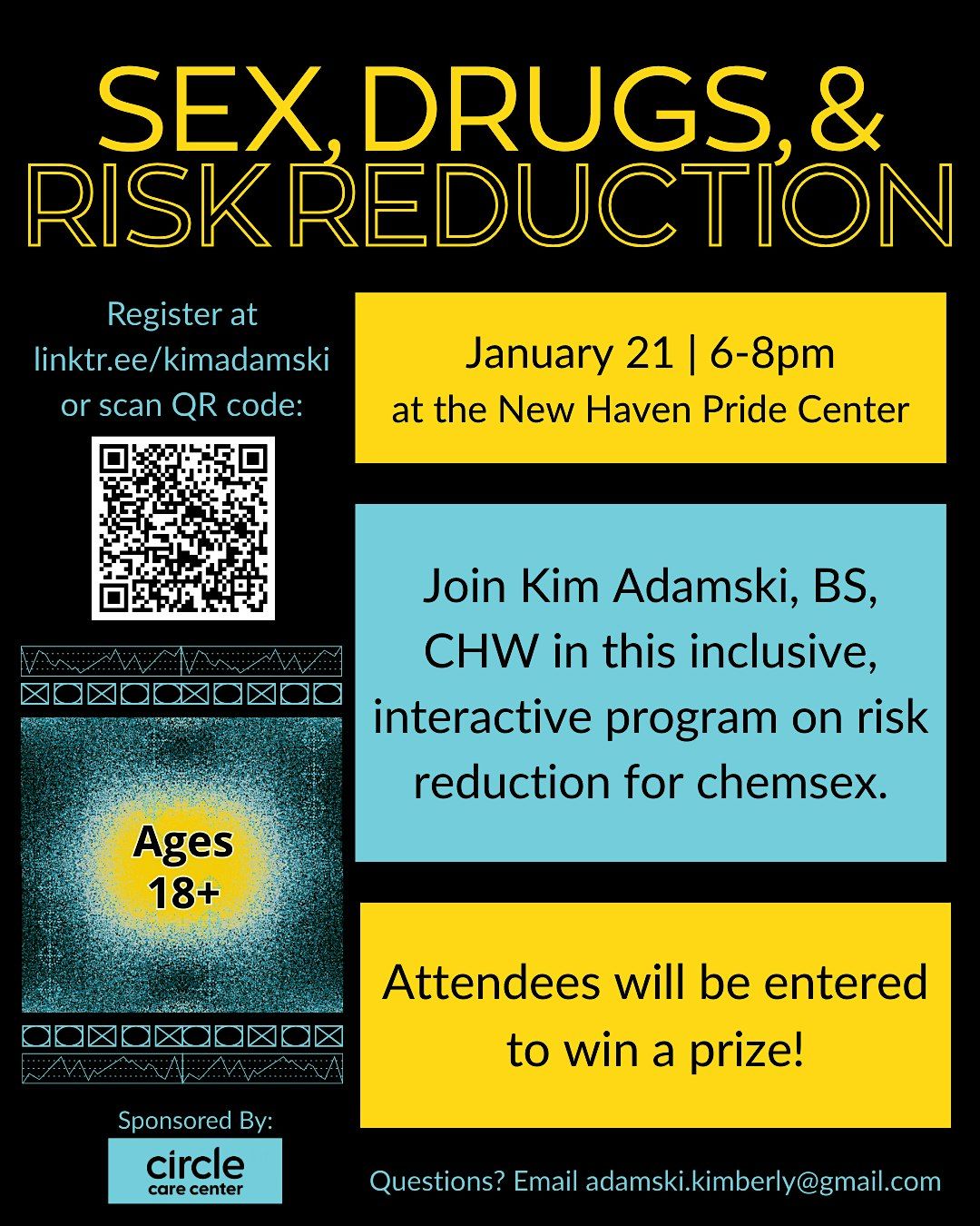 Join Kim Adamski, BA, CHW for a FREE discussion-based sex ed program. Learn about risk reduction for chemsex (the use of drugs/substances to alter or enhance the feelings of sex). This program will begin with a safer sex review before moving on to talk about the risks and risk reduction strategies for specific drugs; an opiate overdose reversal training; and discussion on consent and boundaries when engaging in chemsex.