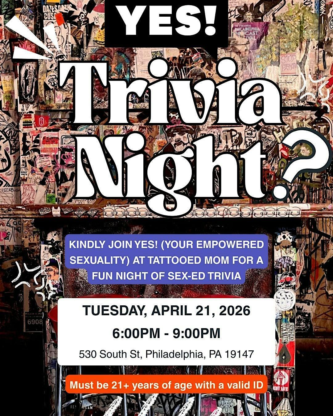 Gather of your team (up to 6 people) and join YES! at Tattooed Mom for a night of sex ed trivia and fun prizes. Money raised through tickets will help raise funds for YES! and their ongoing efforts to educate people in Philadelphia.