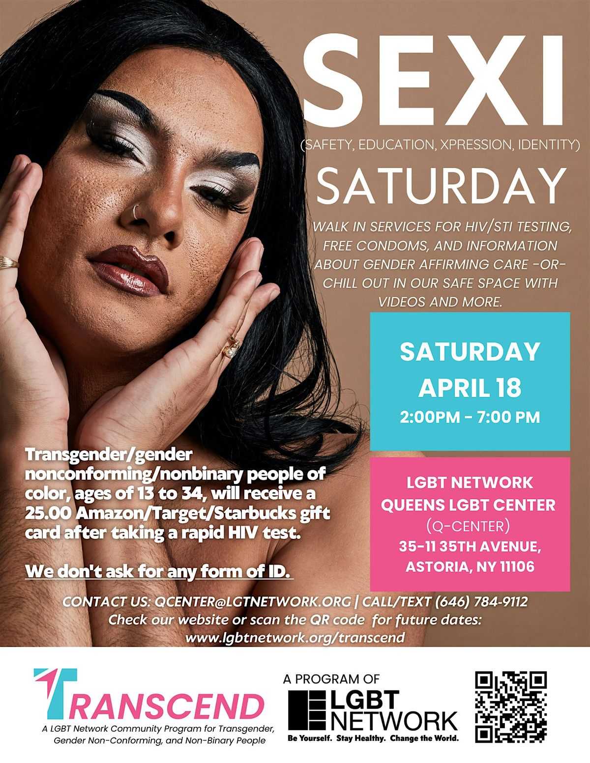 Saturdays are SEXI: for Safety, Education, Xpression, Identity! Come drop in for services such as HIV/STI testing and gender affirming care referrals. TGNCNB folx of color between the ages of 13 and 34 will get a $25 gift card when they test with us, and anyone who refers someone within these demographics will also recieve a $25 gift card. Hang out with others, chill, play games, or add to our video playlist!