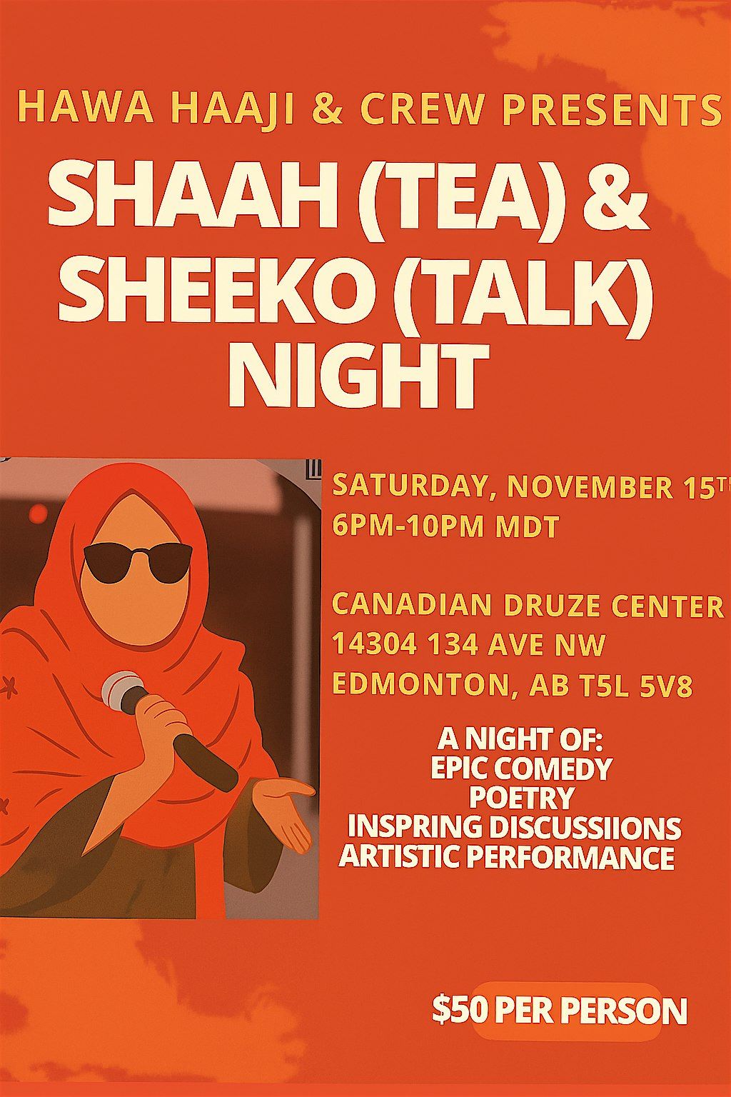 At Shaah (Tea) & Sheeko (Talk) Nights, attendees will be immersed in the rich beauty of storytelling, poetry, and epic comedy that will have you laughing out loud.