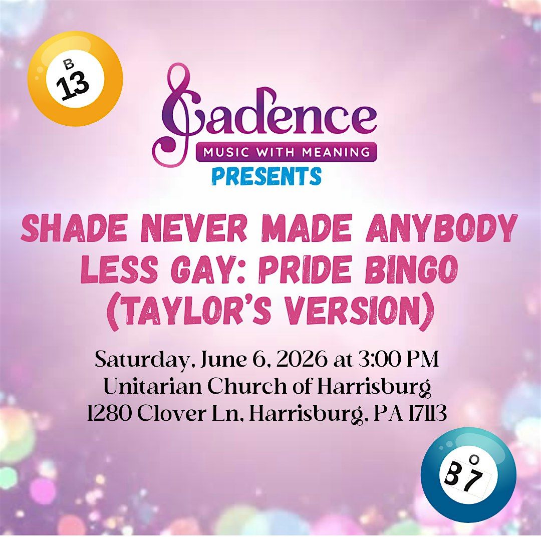 Get ready to shake it off and dab it up at Cadence Chorus' first-ever Drag Bingo event! Join us on June 6, 2026, at 3 PM (doors open at 2:30 PM) at the fabulous Unitarian Church of Harrisburg for a day of laughs, love, and a sprinkle of glitter! 🎤✨
