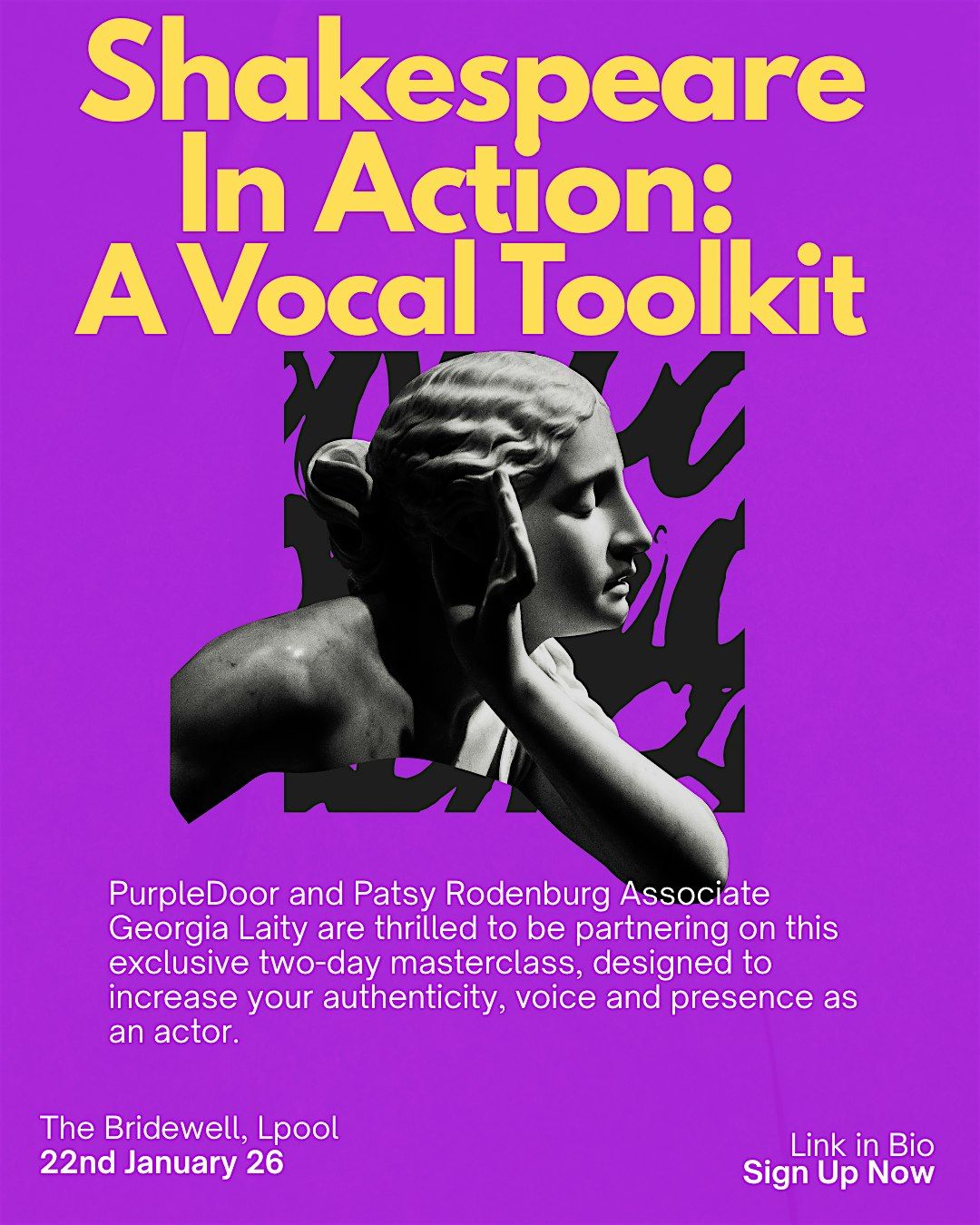 PurpleDoor and Patsy Rodenburg Associate Georgia Laity are thrilled to be partnering on this exclusive two-day masterclass, designed to increase your authenticity, voice and presence as an actor.