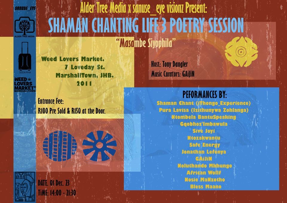 Alder Tree Media formally known as CBS Productions and Sanuse_eye visionz are bringing you the 3rd installation of Shaman CHANTing Life Poetry Session.Masambe Siyophila