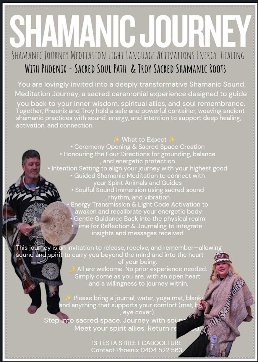 Together, Phoenix and Troy hold a safe and powerful container, weaving ancient shamanic practices with sound, energy, and intention to support deep healing, activation, and connection.
