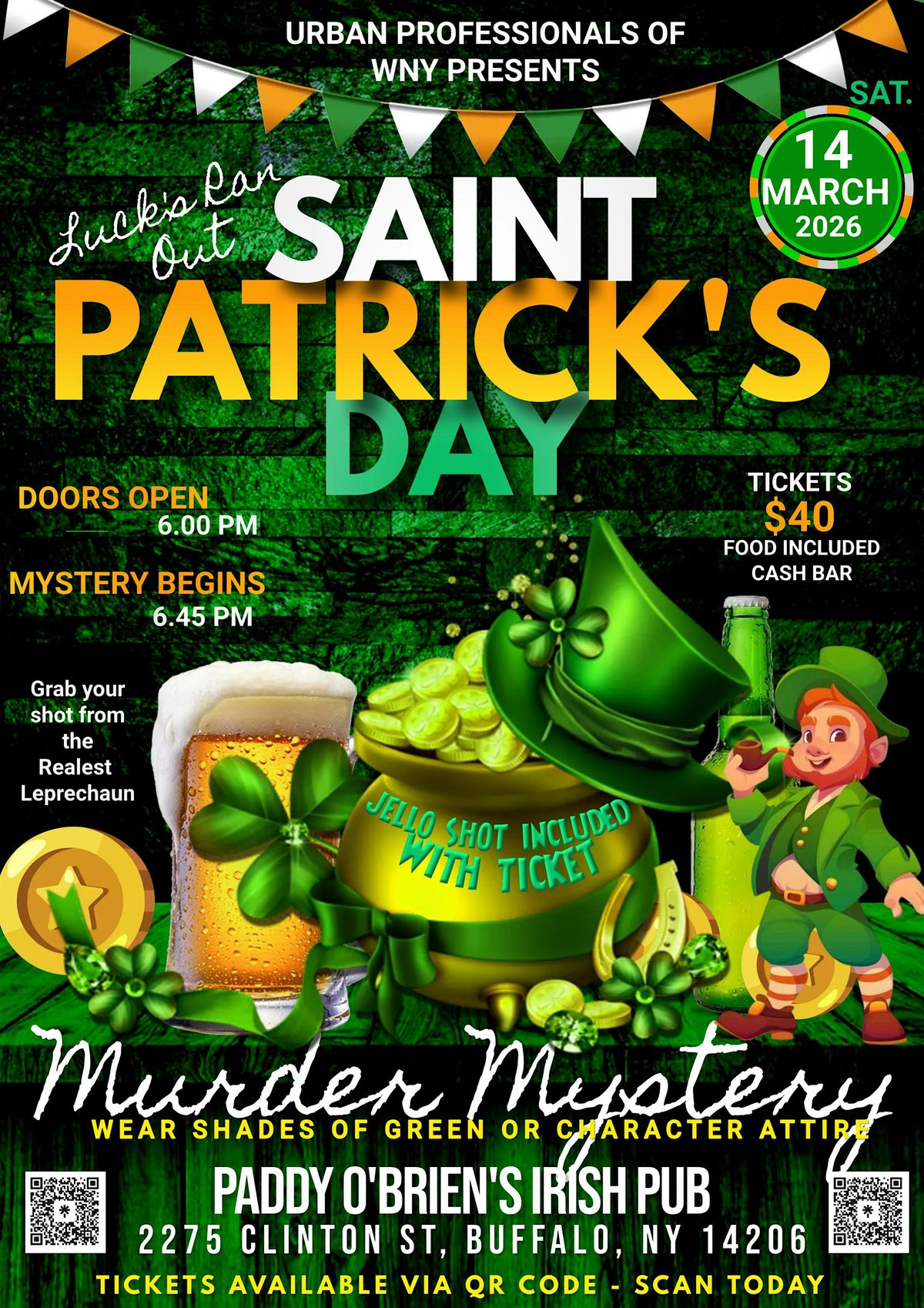 Get ready for a thrilling night full of twists, turns, and laughs! Our in-person event brings together mystery lovers for an unforgettable evening of clues and surprises. Dress up in your character or wear a shade of green, team up, and put your detective skills to the test to solve the Shamrock M**der Mystery. It's all about fun, intrigue, and Irish charm. Don’t miss out—be part of the action and see if you can crack the case!